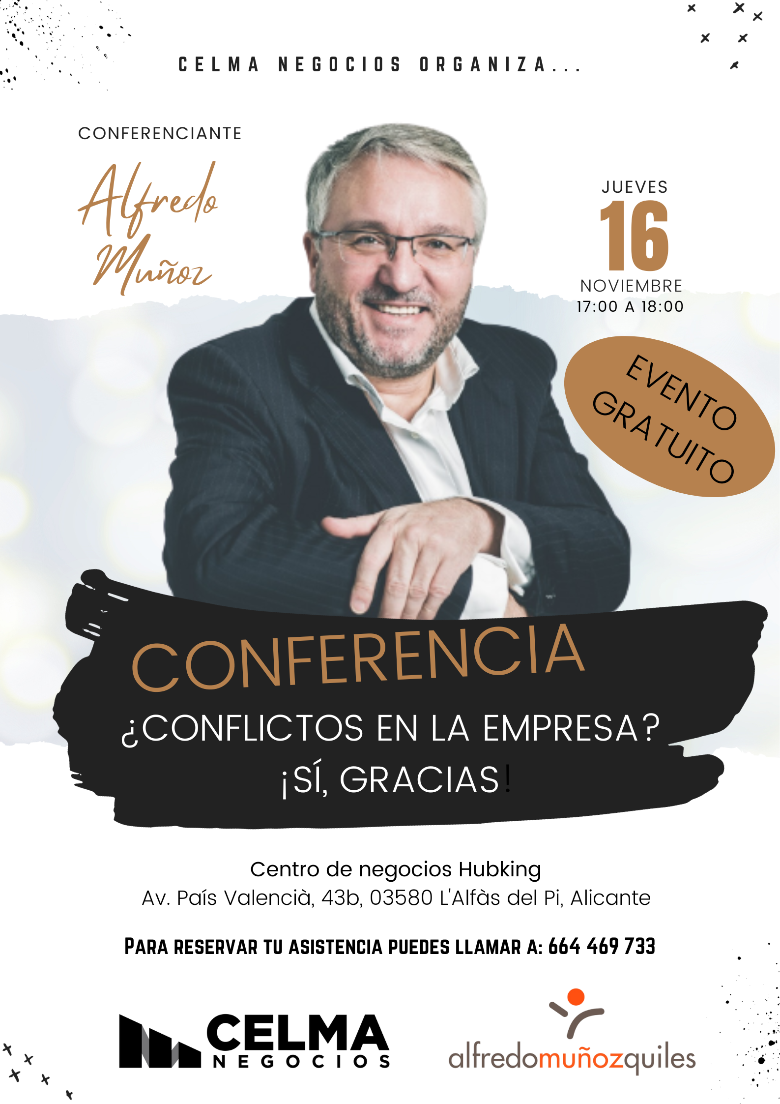 El jueves 16 de noviembre, CELMA organiza una conferencia con un gran profesional como Alfredo Muñoz que es Mentor de Talento, nos dará esas pinceladas para la gestión de los conflictos.