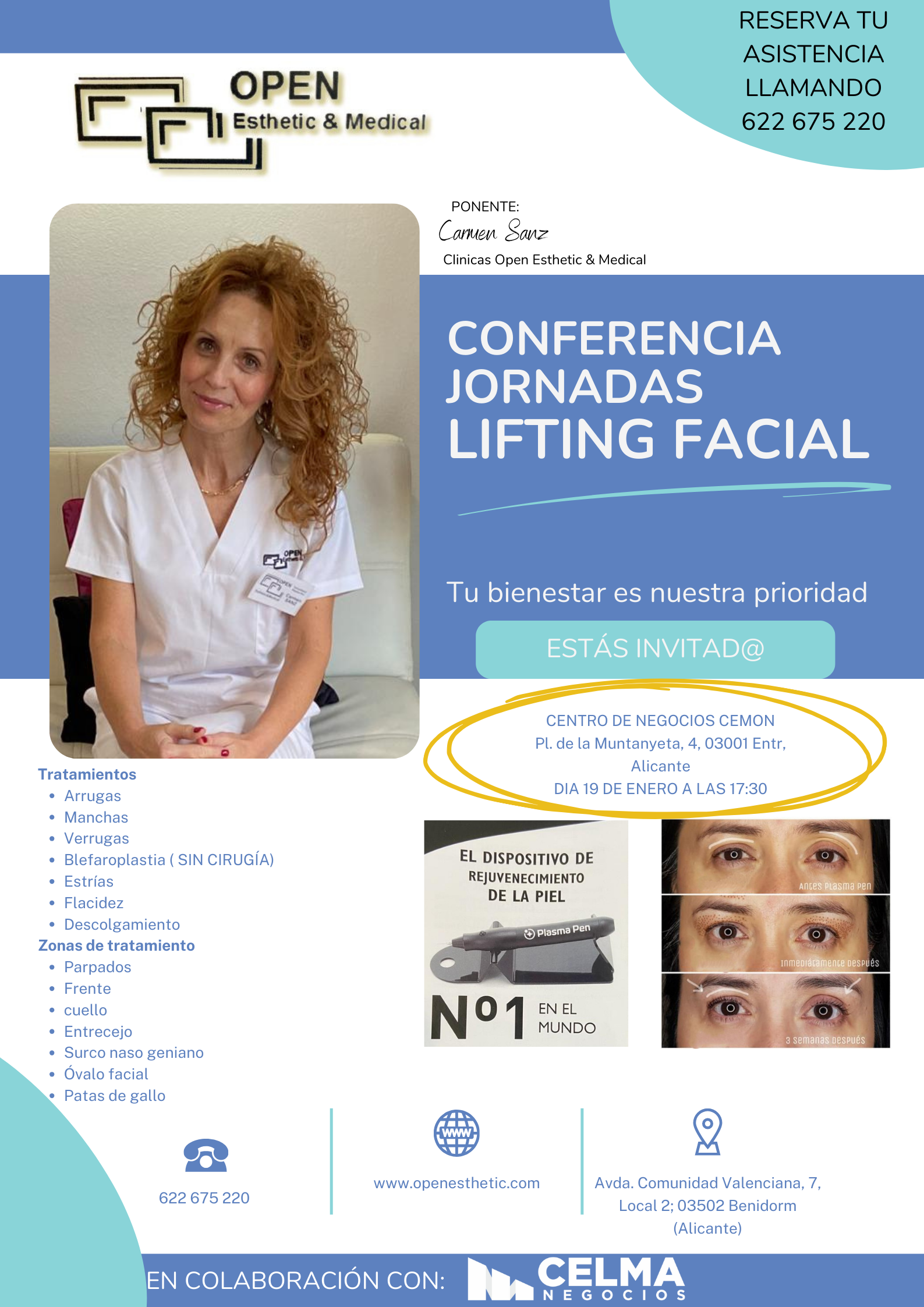 El 19 de diciembre a las 17:30 OPEN ESTHETIC & MEDICAL empresa miembro de CELMA NEGOCIOS, organiza en Alicante una conferencia sobre Lifting Facial, en CENTRO DE NEGOCIOS CEMON. Para reservar tu asistencia solo debes de llamar al teléfono: 622 675 220 es GRATUITA.